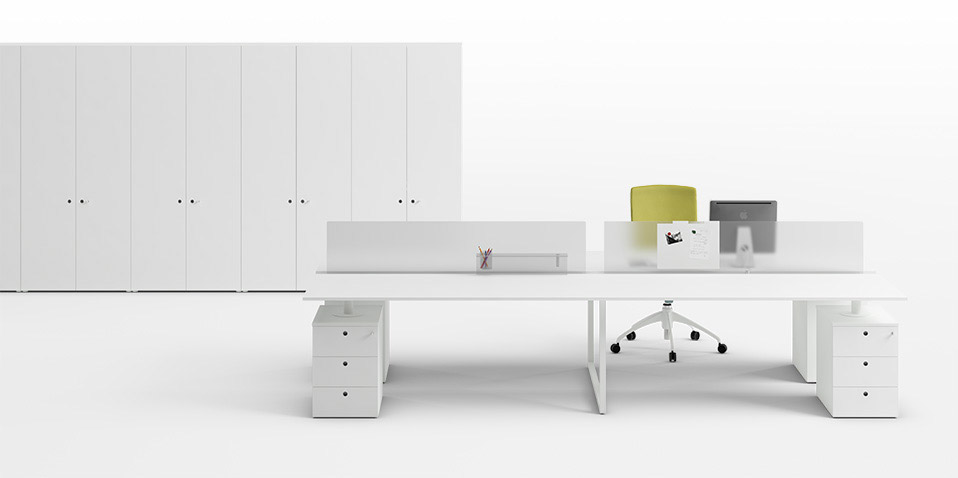 Zamknięte geometryczne formy stelaża o kwadratowym przekroju są motywem przewodnim kolekcji, w której biurko wysokie na 75 cm wykończone cienkim 18 mm